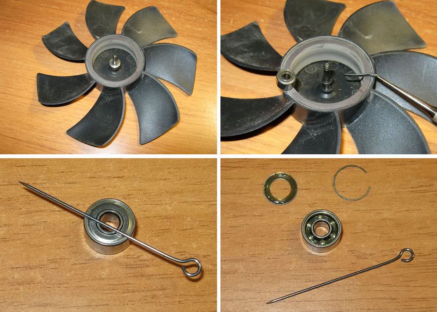 Подшипник качения (первый на рисунке выше) состоит из двух колец различного диаметра, вставленных одно в другое. Между кольцами размещены тела качения, например, шарики, цилиндры или ролики, и сепаратор – элемент, который разделяет и удерживает тела качения на месте. Во внутреннее кольцо плотно вставляется вал крыльчатки вентилятора – эти две детали вращаются вместе. Смазка заполняет полости между телами качения, сепаратором и поверхностью колец.