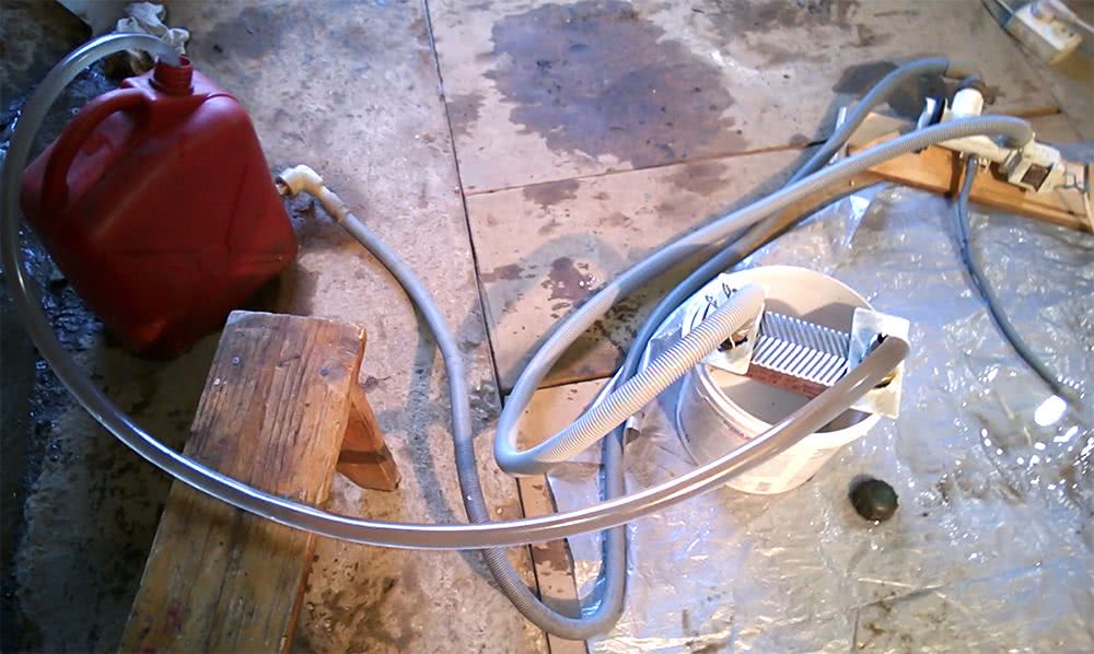 Мы рекомендуем использовать 10 л раствора, этого будет достаточно для стабильной прокачки через любой теплообменник. В емкость с раствором (канистра, прочная баклага, пластиковое ведро) помещается шланг, подсоединенный к теплообменнику. Далее, с другой стороны теплообменника шланг соединен с циркуляционным насосом и, наконец, от насоса идет шланг к емкости с раствором, как можно ниже ко дну или герметично вмонтирован в дно емкости. В итоге раствор циркулирует между канистрой и теплообменником.