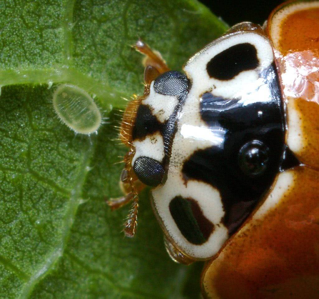 Как отличить арлекина от других божьих коровок? Непросто – вид имеет широкий ряд цветовых вариаций, поэтому насекомые могут быть и черными, и красными, и оранжевыми, с разным количеством точек или вообще без них. Единственным достоверным отличием являются белые пятнышки в районе головы, хотя и те могут быть присущи некоторым европейским видам.