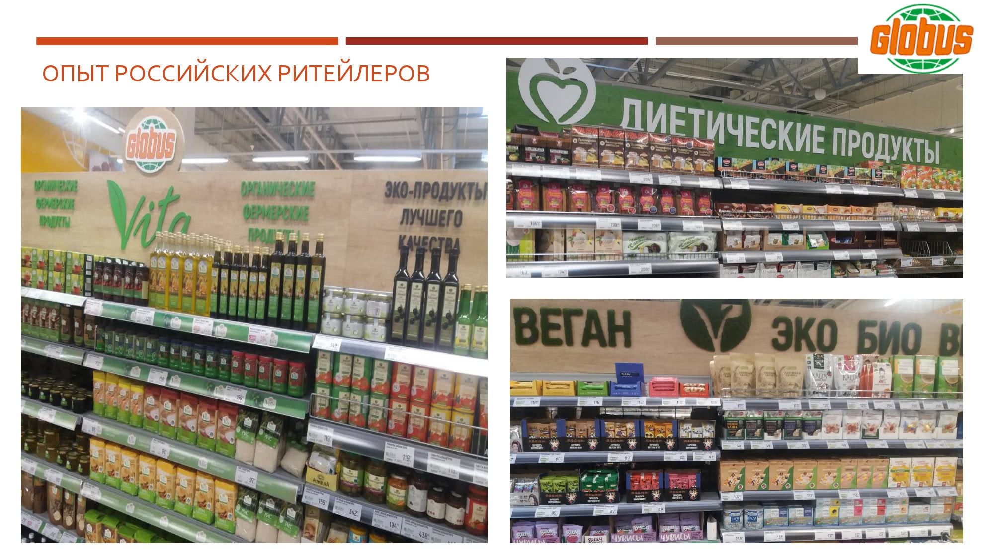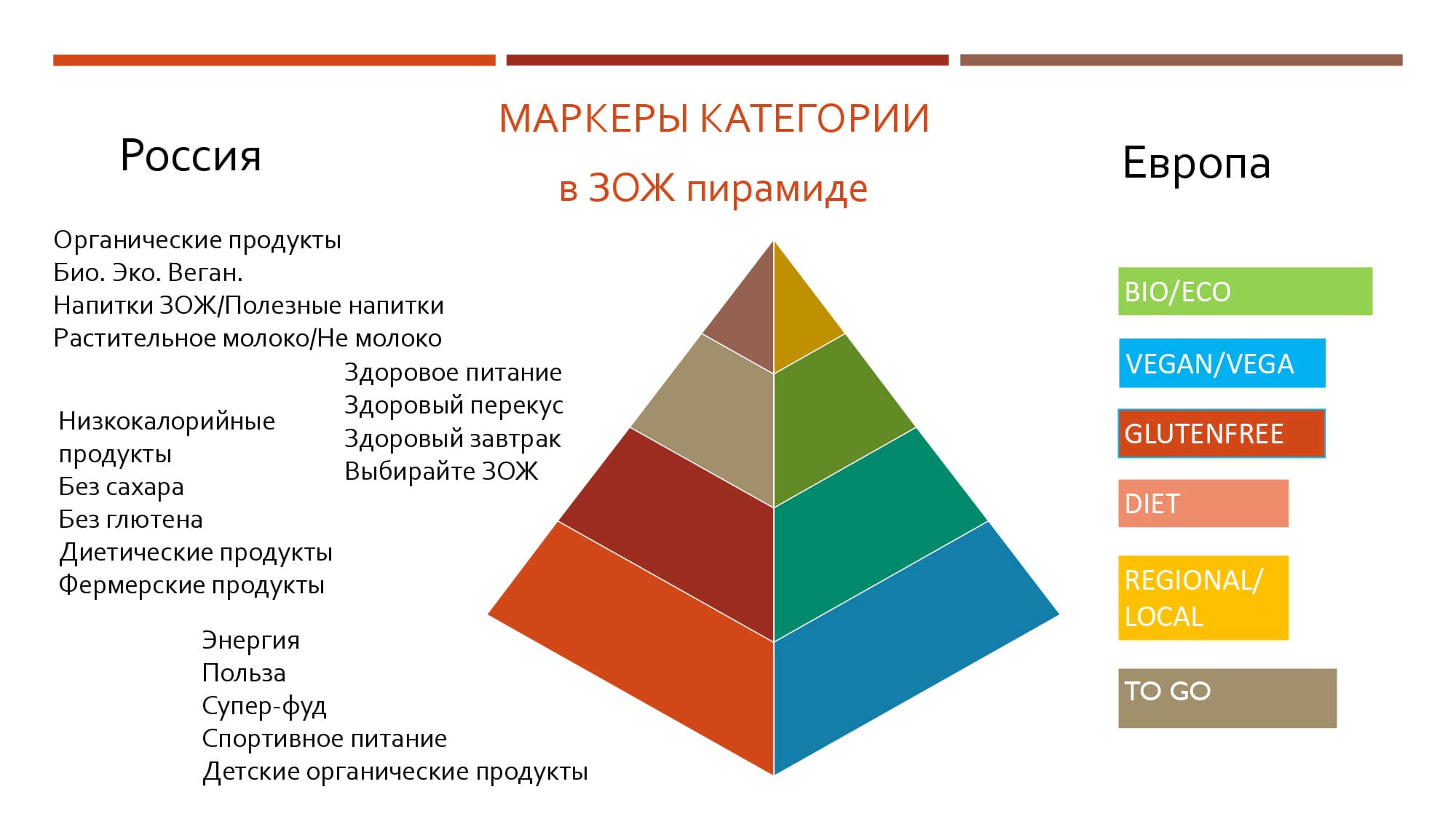 Россия значительно разнообразнее в вариантах. Это и классические органик, фермерские продукты, спецпитание, а также ситуации покупок: здоровый завтрак, перекус, спорт, энергия и даже детские органические продукты.