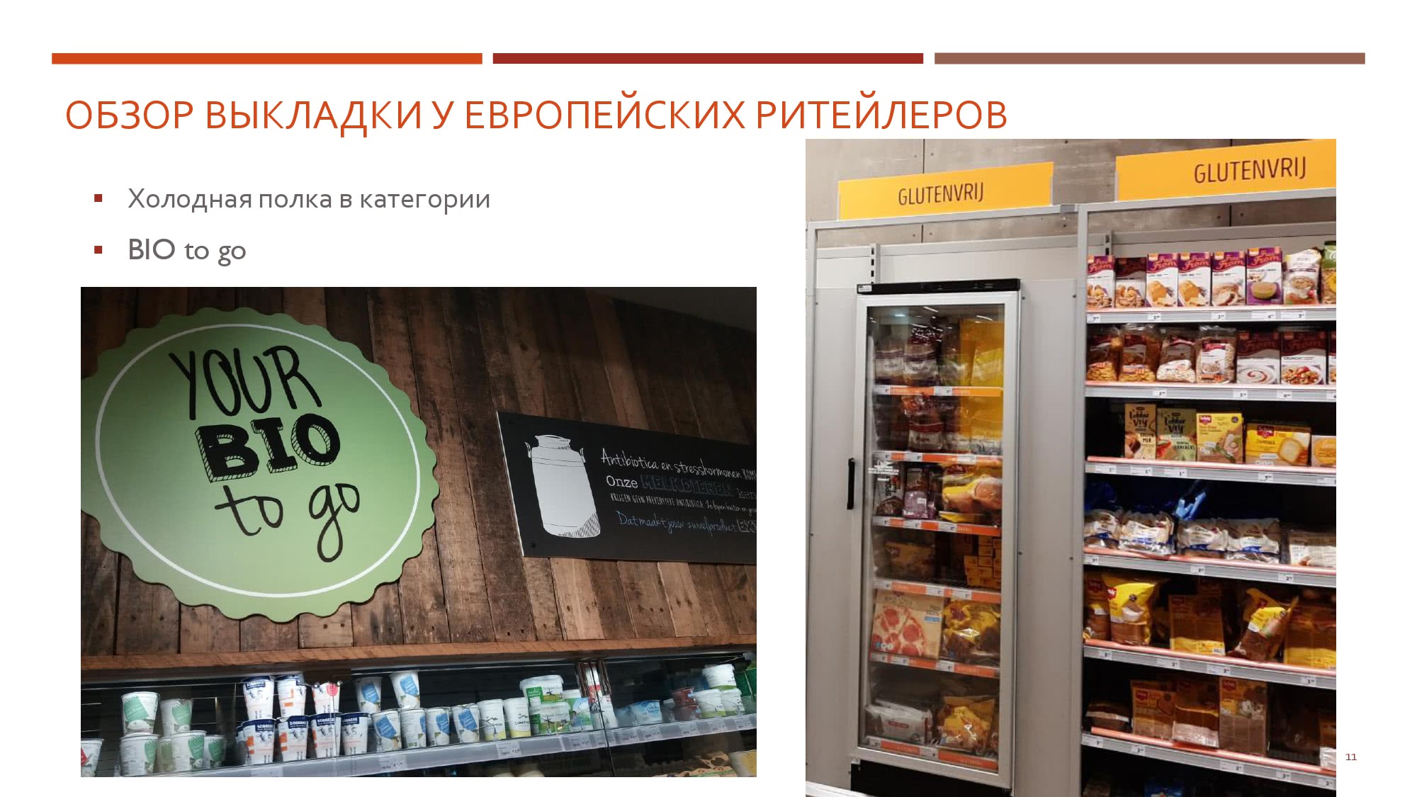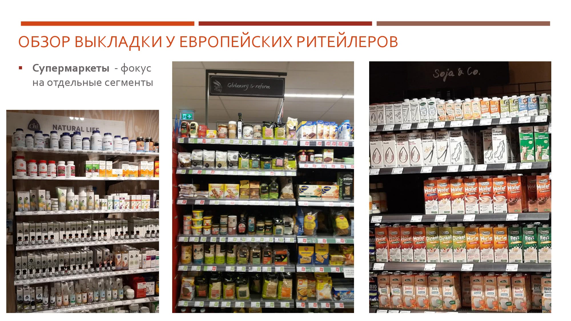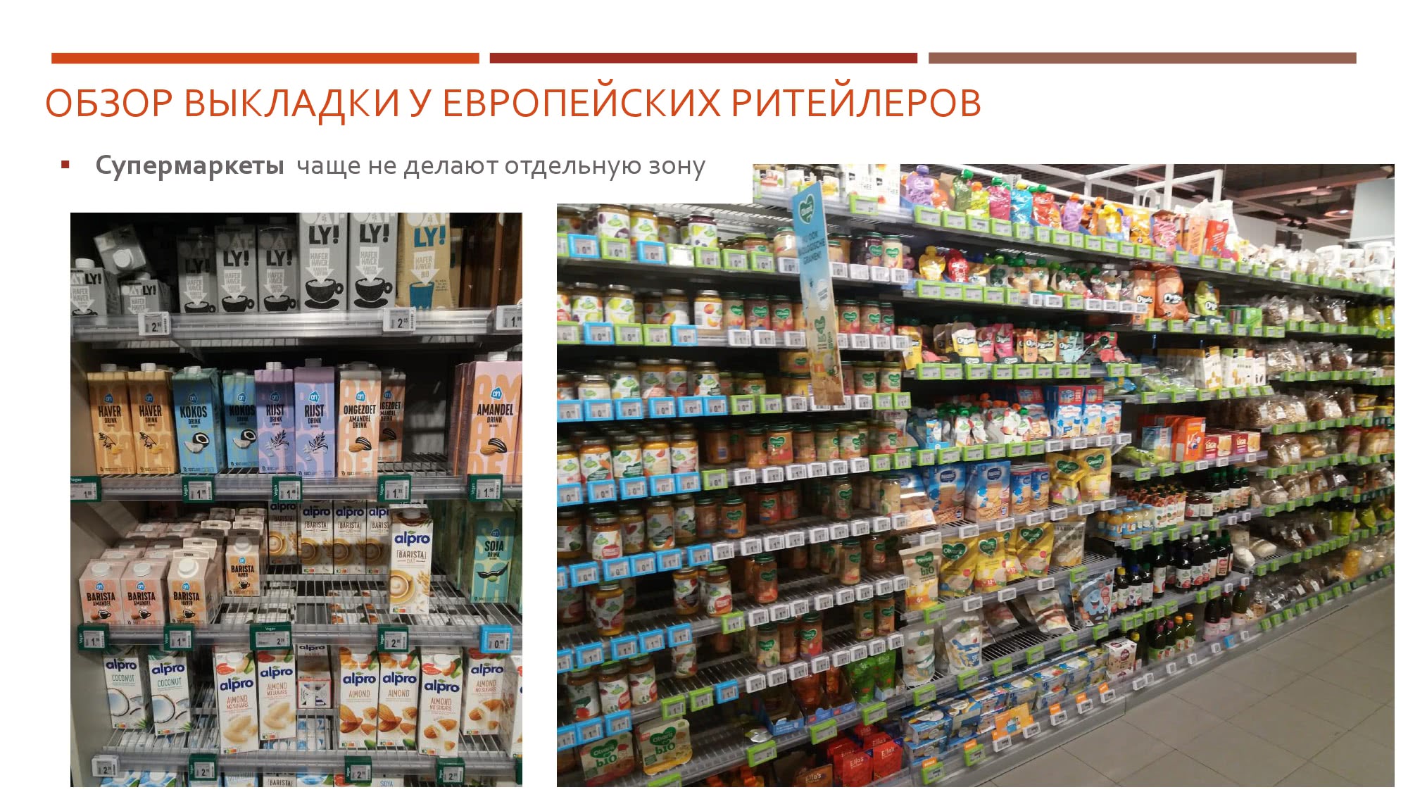 В гипермаркетах, как правило, это выделенная зона с четкой сегментацией внутри категории (пример JumboFoodmarket, Нидерланды). Большая зона выкладки Bio, Vegan, Vega, Gluten free.