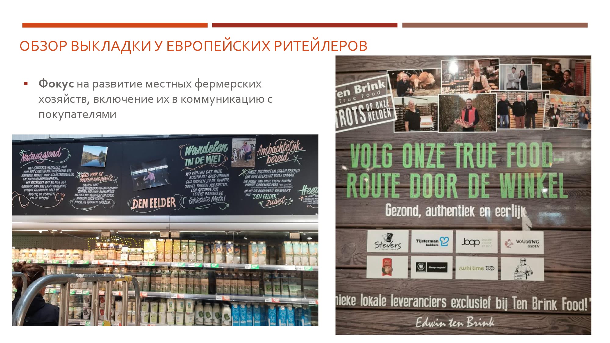 Европейские ритейлеры отдельно позиционируют фермерские продукты, тем самым поддерживая развитие местных (локальных) натуральных хозяйств. Мы видим на полках фермерские продукты с качественно выстроенной эмоциональной коммуникацией от лица фермеров. Реализована категорийная стратегия «Построение эмоциональной связи с покупателями», которая держит сильнее, чем любое ценовое предложение.