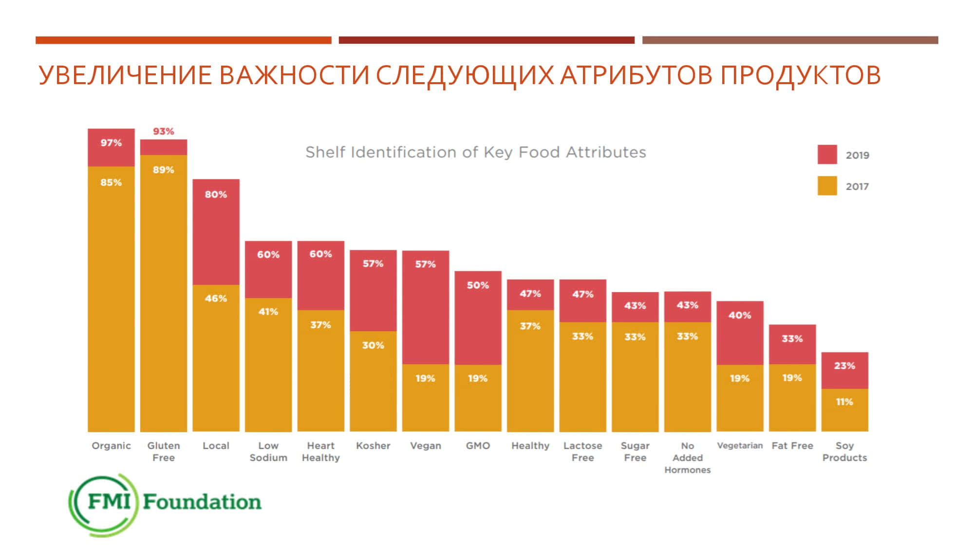 По данным американского фонда Food Marketing Institute (FMI), который проводит исследования по темам здорового питания и безопасности пищевых продуктов, с 2017 по 2019 годы существенно выросла важность таких атрибутов как «органик», «без глютена», «без лактозы», «без сахара», продукты местных производителей (фермерские), vegan и вегетарианские и т.д.