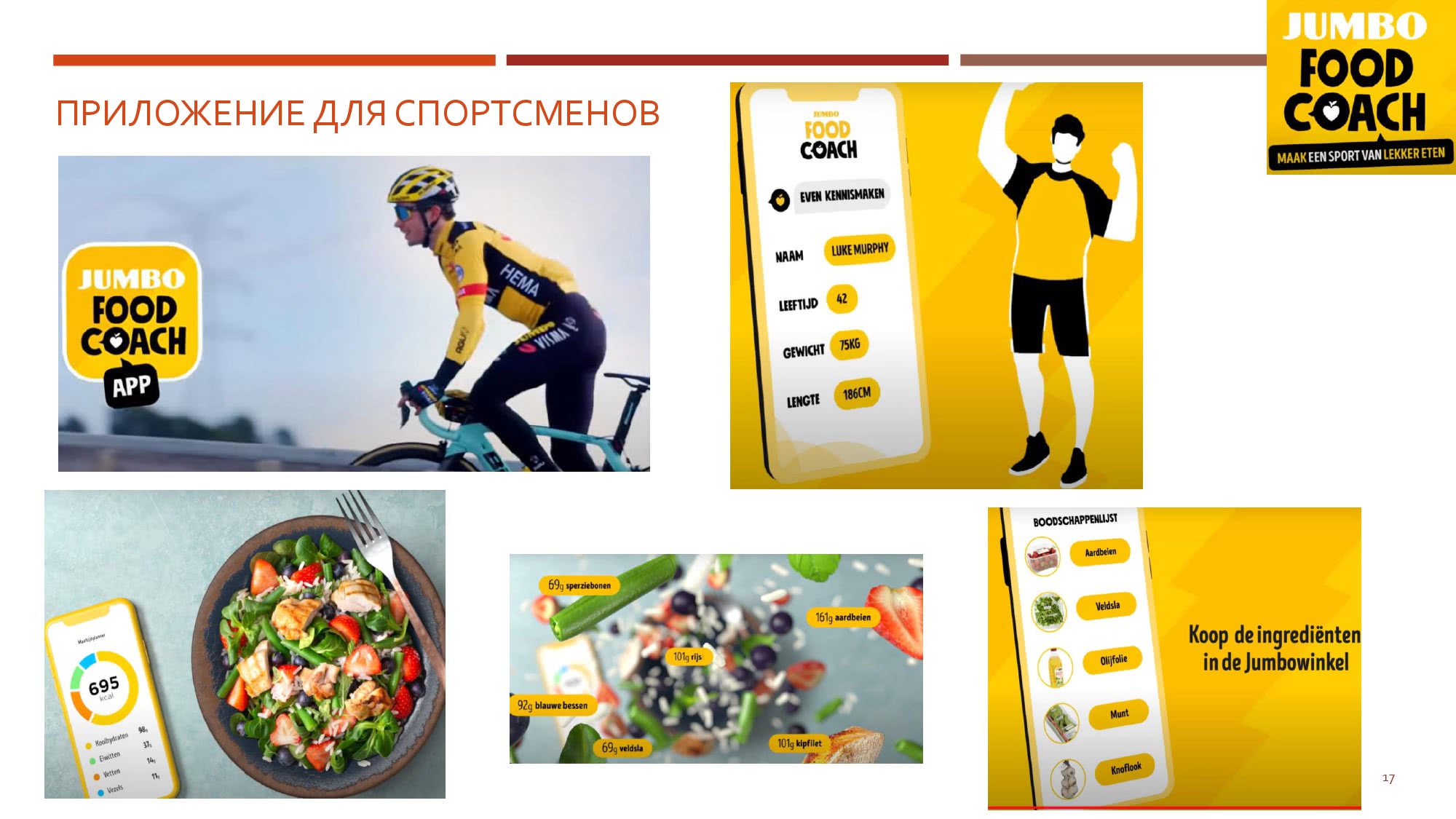 Европейский ритейлер Jumbo, видя высокий интерес к спорту, который еще более вырос в период пандемии, запустил приложение Food Coach, пользователям которого тренер помогает составить план питания при занятиях велосипедным спортом. Были привлечены ученые и эксперты в области питания и спорта. Супермаркет преобразует план и рецепты в список продуктов и высылает персонализированное предложение владельцам приложения при посещении магазина.
