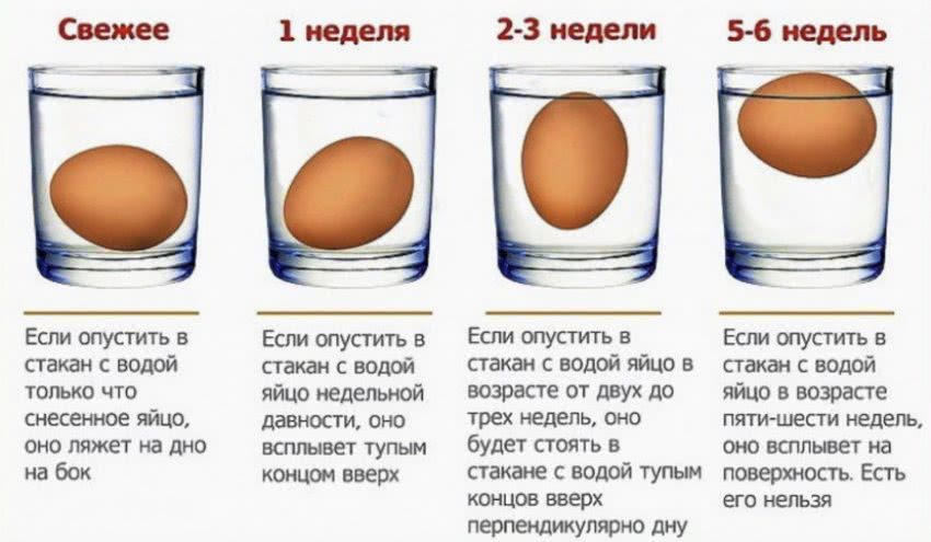 Этим способом можно узнать примерный «возраст». Через 2-3 недели яйцо начинает подниматься, зависает в середине стакана. Через 5-7 недель практически полностью всплывает. Этот факт сигнализирует об истекшем сроке годности.