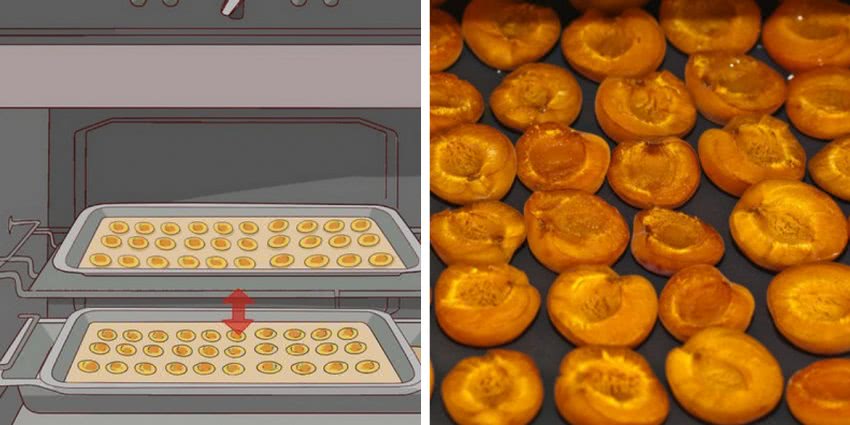 Курагу можно высушить в обычной духовке, которая есть у каждой хозяйки. Предварительно рекомендуется просушить половинки абрикосов при комнатной температуре на протяжении 3–4 часов (лучше удалить лишнюю влагу перед тем, как приступить к термообработке). Противень застелить пергаментом, после чего на него разложить половинки абрикосов так, чтобы они не соприкасались друг с другом. Температура не должна превышать 60 градусов. Нужно слегка приоткрыть духовку для того, чтобы избежать пригорания. Также для достижения лучшего качества кураги и ее равномерного высушивания необходимо периодически переворачивать абрикосовые дольки. Следует внимательно следить за состоянием будущей кураги, так как она может пересохнуть и стать невкусной, если ее передержать. Чтобы обеспечить идеальный результат, после приготовления курагу выдержать еще несколько часов при комнатной температуре (это обеспечит полное испарение лишней влаги)