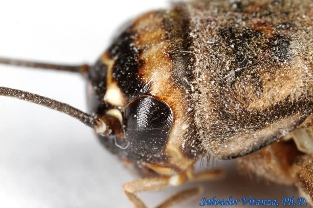 Как видно на фото сверчка домового, он представляет собой насекомое серо-желтого цвета, украшенное пестрыми и коричневыми пятнами на туловище и тремя полосками на яйцевидной голове, длина взрослой особи – 15-25 мм. Глаза расположены с обоих боков головы. Впереди торчат длинные усы, по размеру больше, чем само насекомое, они служат органом осязания. Туловище укрыто специальным хитиновым панцирем, который защищает от внешних воздействий и уменьшает потери влаги в организме.