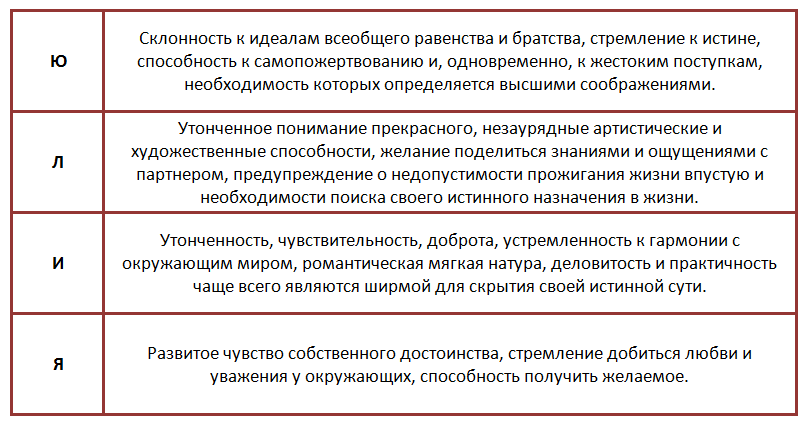Л – эстетический взгляд на вещи, творческие способности. Такой человек интересен в общении, умеет располагать к себе, уступать и подстраиваться под других людей. Обожает сюрпризы и нестандартные ситуации. Умеет любить, хранит верность избраннику. Желает делиться знаниями, эмоциями и ощущениями со второй половинкой. Сильно привязан к родным людям.