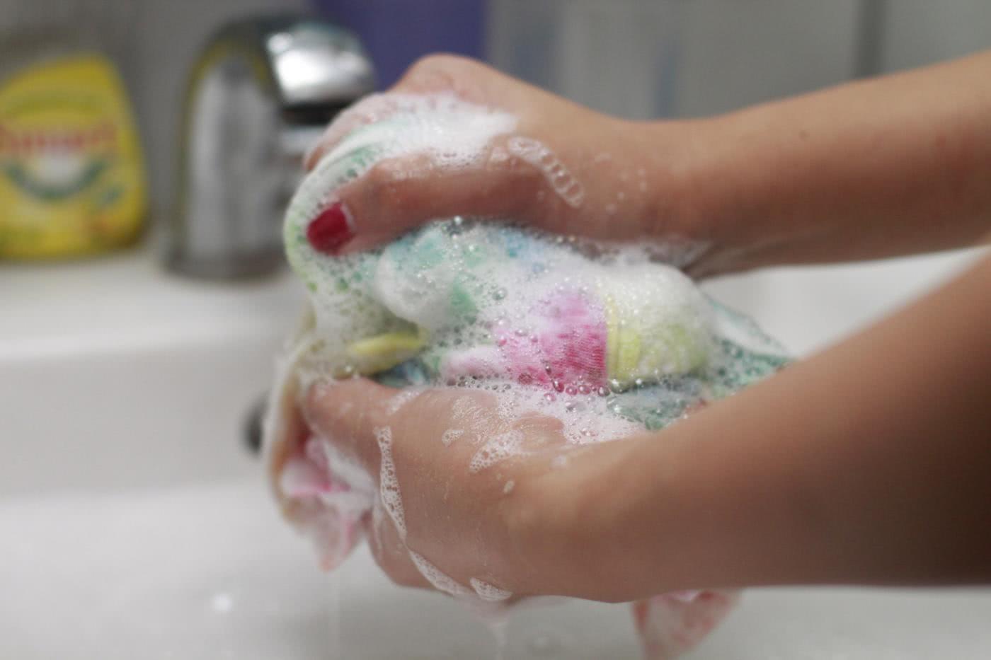 - После замачивания тщательно потрите пятна руками.