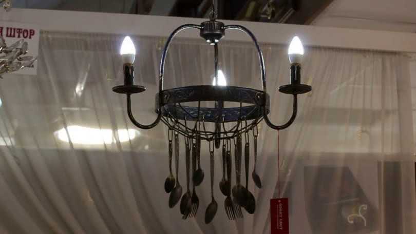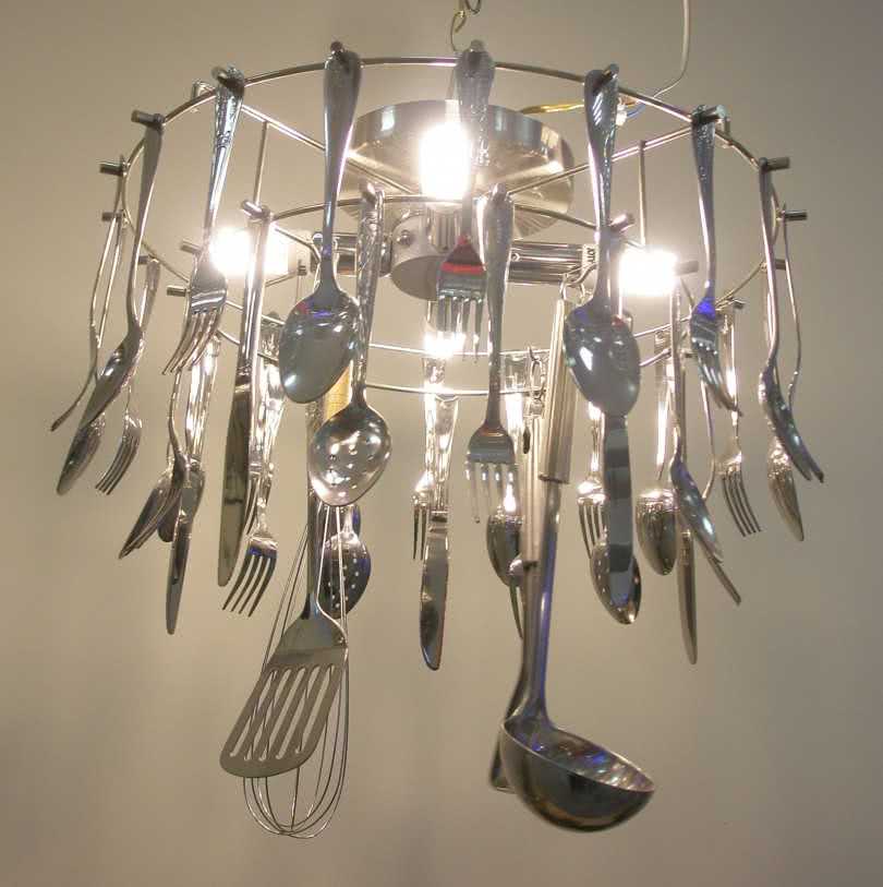 Связанные вместе чайные ложки могут быть использованы для декорации люстры, а также можно комбинировать их, создавая интересные украшения. Просто попробуйте аккуратно собрать чайные ложки в форме лепестков роз. Интересные поделки могут быть сделаны с помощью пластиковых вилок, такие как цветы или веер из пластмассовых вилок своими руками.