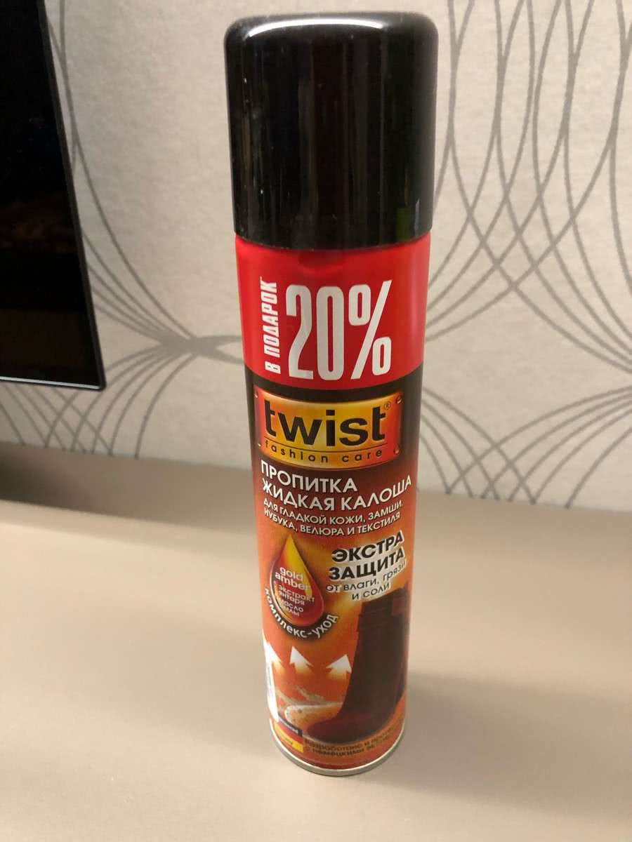 В категории «недорогие» низкой стоимостью смело хвастает пропитка-аэрозоль российского изготовления «Твист». Это многофункциональное средство, подходящее для обуви любого типа: нубук, кожа, замша, текстиль и так далее. Но самую большую востребованность состав заслужил в вопросе протекции изделий из кожи от природных факторов (грязь, влага). Пропитку можно купить в пузырьке объемом 250 мл. В составе пропитки используется смола золотистого янтаря. После нанесения на обувном покрытии появляется водоотталкивающая плиссировка, защищающая изделия от различных погодных факторов и деформирования, которого если не ухаживать за обувью зимой и осенью попросту не избежать. Действенные составляющие средства не просто тщательно берегут обувь из кожи, но и помогают материалу восстановиться. Следовательно, старые сапоги еще рано списывать со счетов, их поможет освежить пропитка Twist.
