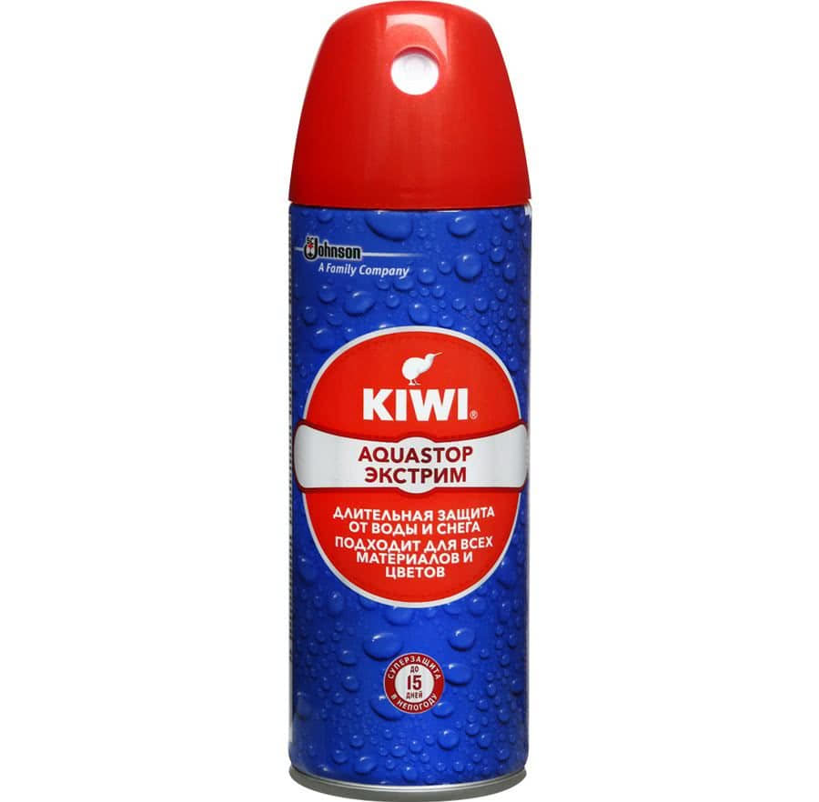 Пропитка Kiwi защитит обувь и одежду от воды и пятен. Ее формула даёт максимальную защиту. Высокая концентрации плюро полимеров помогает образовывать не видимую глазу пленку, что способствует защите обуви от дождя и грязи. Выпускается в баллоне небольшого размера с пульверизатором.