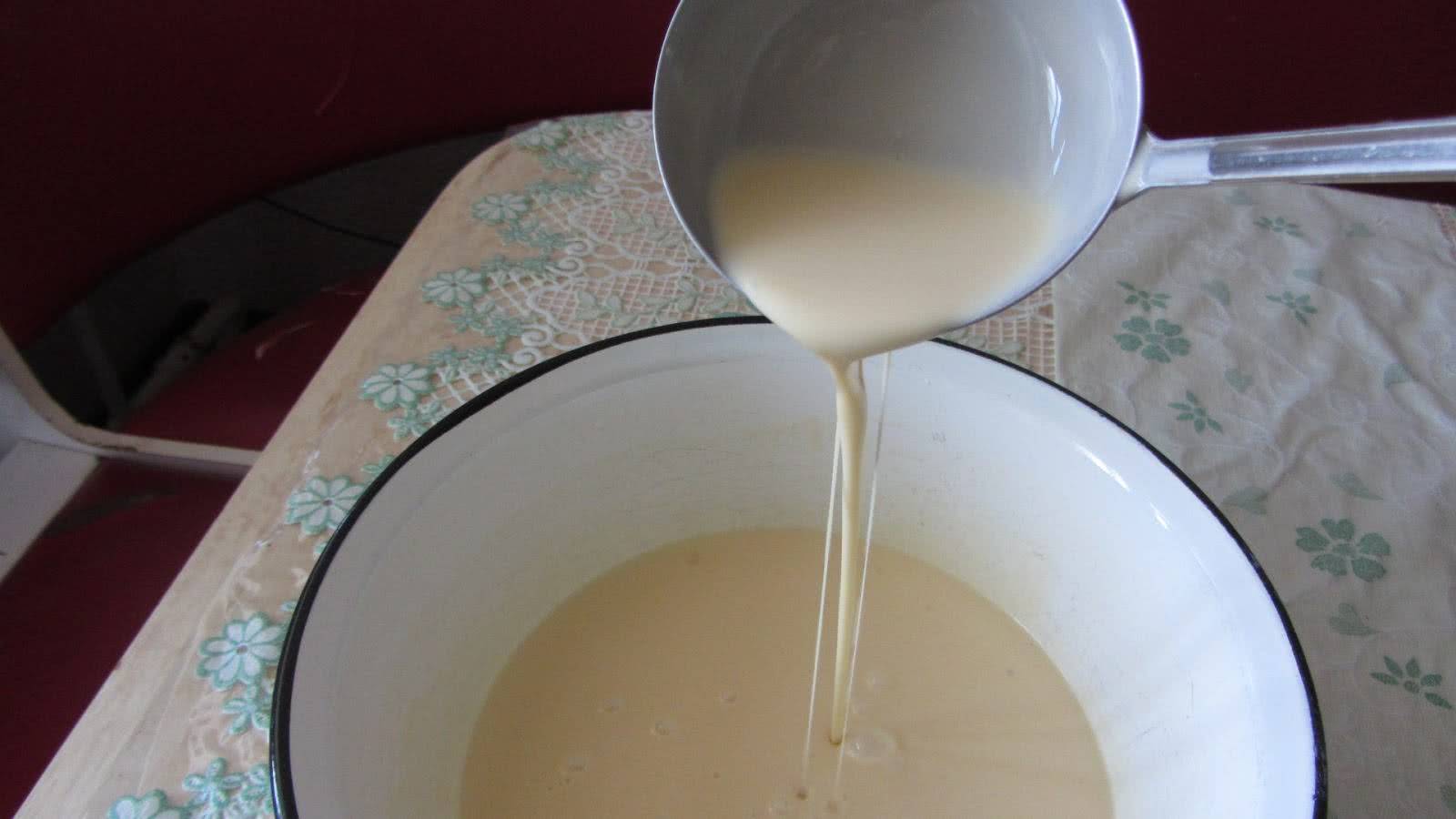 - В разбавленное молоко вбиваются яйца. Вся смесь подслащивается, подсаливается половиной ложки соли, вымешивается до однородности.